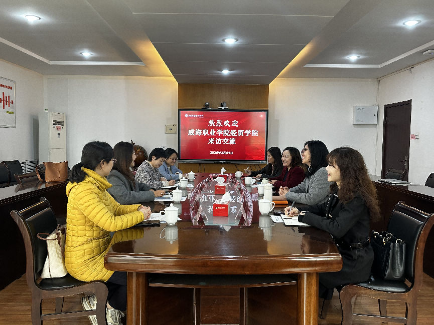 2026年3月24日上午10时,威海职业学院经贸学院院长林媛一行4人到访我校,在行政楼201室与我校跨境电子商务系、国际运输与物流系开展专业建设与校企合作专题交流研讨。