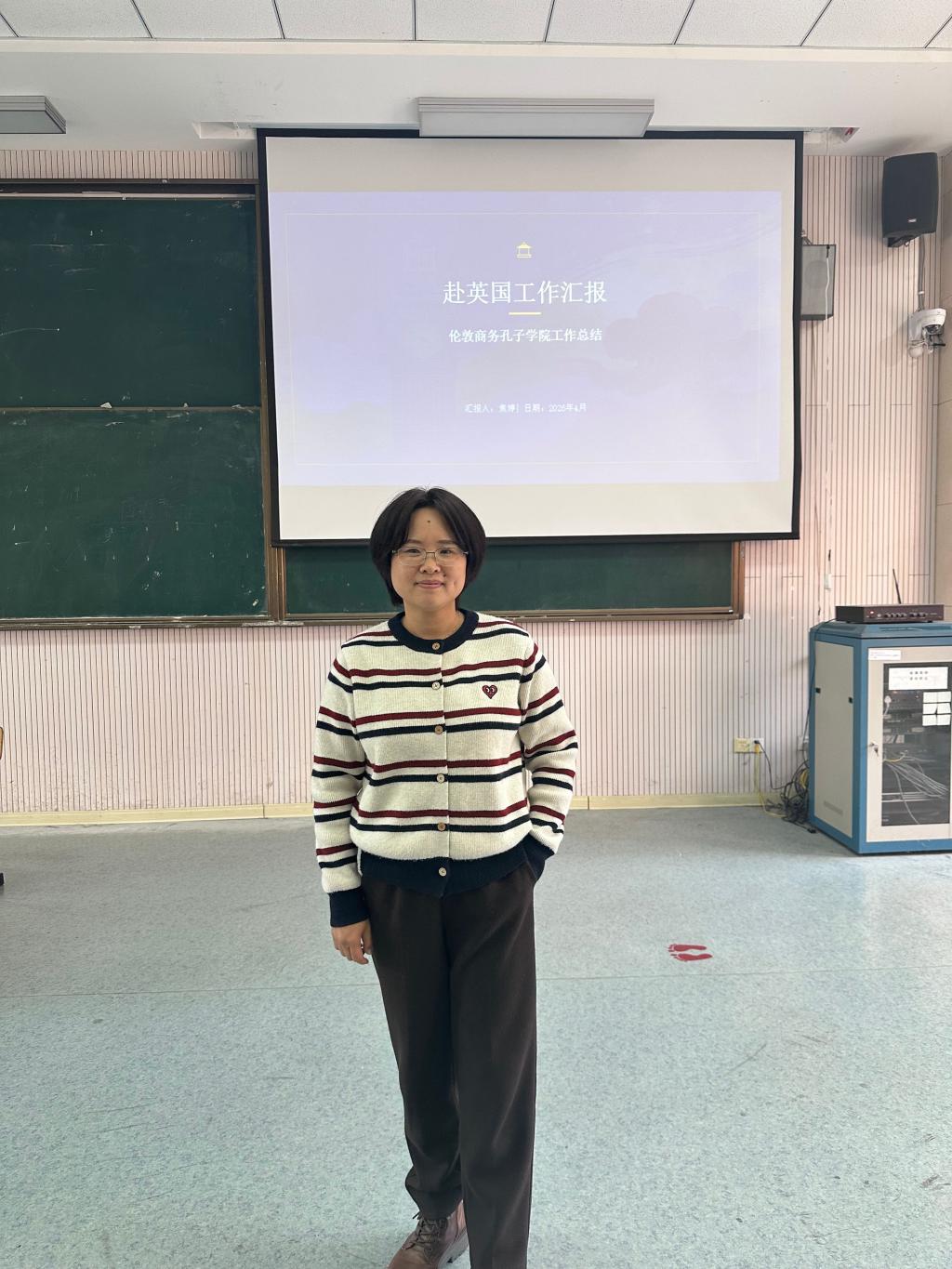 焦婷老师于2024年1月至2026年1月赴英国伦敦商务孔子学院开展汉语教学与中外文化交流工作。此次汇报内容详实、案例丰富,既让与会教师直观了解海外孔子学院教学模式与文化交流工作实况,也为商务外语系课程设计、教学方法创新提供了鲜活参考,对提升教师跨文化教学能力、强化国际交流意识起到了积极推动作用。与会教师纷纷表示,将借鉴焦婷老师的海外教学经验,进一步优化课堂教学设计,提升国际化人才培养质量。