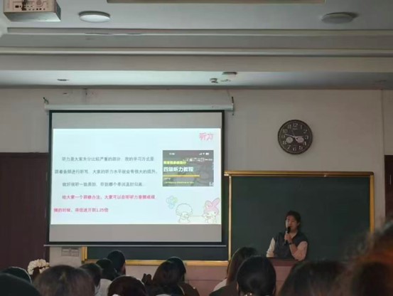 讲座由郭佳老师担任主讲,她结合近年来大学英语四级考试命题趋势,系统梳理了考试题型结构、评分标准及关键注意事项,围绕听力、阅读、写作与翻译等模块进行了深入讲解,并针对不同基础的学生提出分层备考建议,帮助学生明确复习重点,优化学习方法。