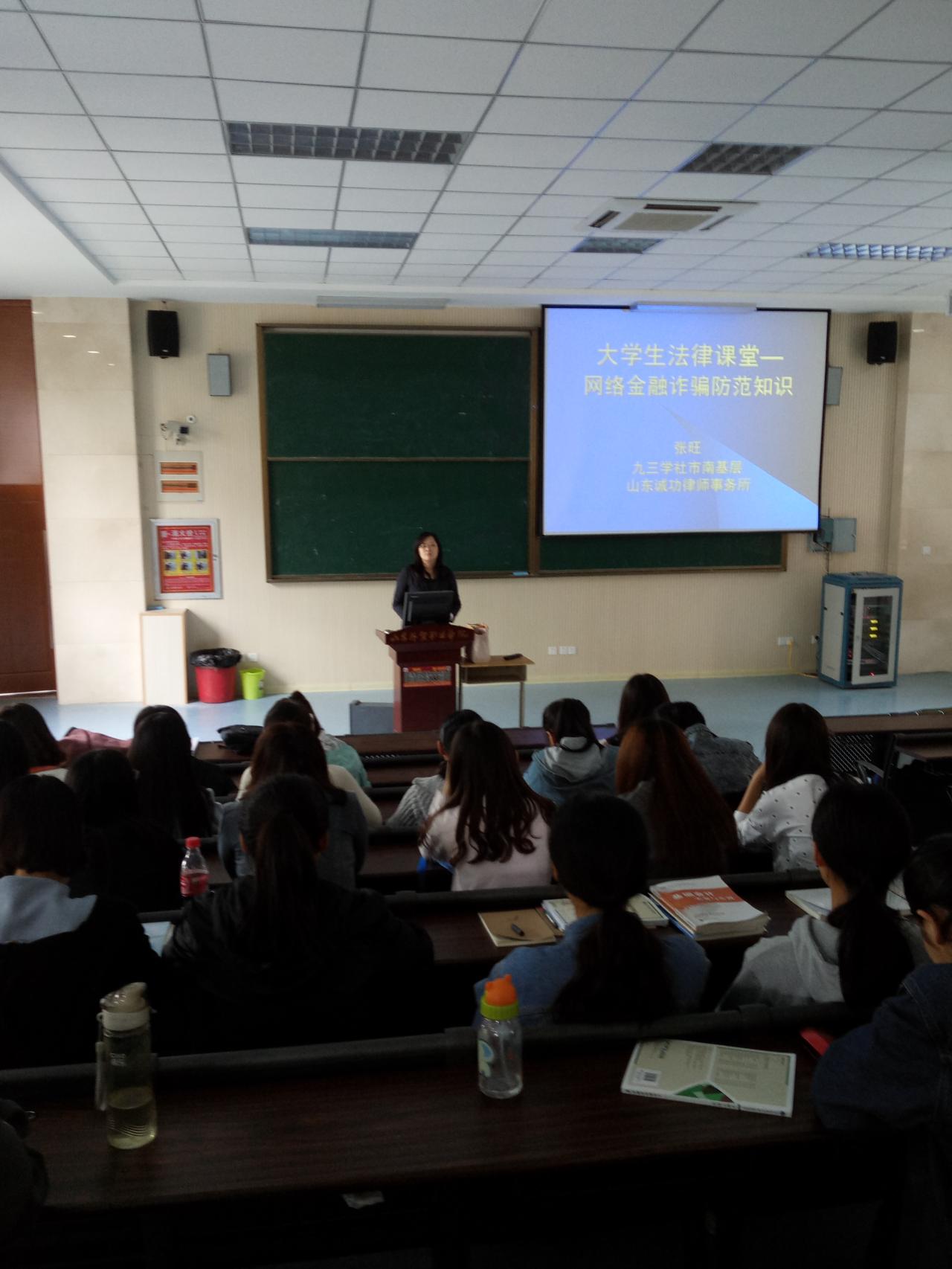 10月20日下午,我院与九三学社市南基层委共建“求真科普基地”系列讲座开讲。九三学社市南委员会基层主委、山东诚功律师事务所合伙人、主任张旺律师从徐玉玉网络诈骗事件说起,以大学新生如何预防网络金融诈骗为主题,诙谐幽默、深入浅出的给我院2016级新生分析了网络金融诈骗的类型、网络金融诈骗量刑的标准和遭遇网络金融诈骗的补救措施等问题,并与学生进行了热烈的讨论和互动。